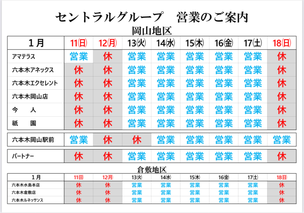 トップ > グループ店の営業御案内 イベント情報EVENT INFORMATION 2026年01月10日 グループ店の営業御案内 上記にて営業を致しております お間違いなき様宜しくお願いします。 < 前へ | 一覧にもどる |